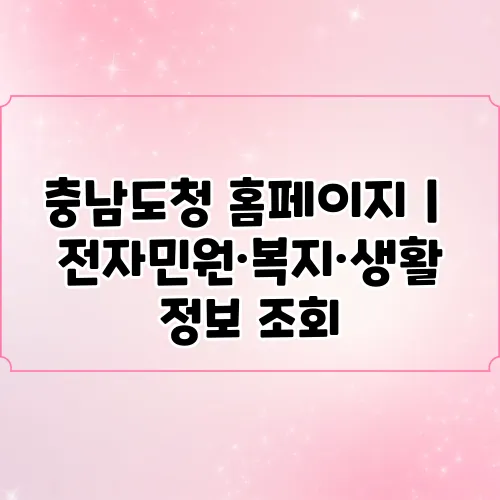 충남도청에서 제공하는 모든 서비스는 도민이 보다 나은 삶을 위해 어떻게 활용할 수 있는지 모색하는 방향으로, 우리는 더욱 풍부하고 향상된 커뮤니티를 만들어 나갈 수 있습니다. 전자민원, 복지정보, 생활정보 조회를 적극 활용하여 충남의 다양한 자원을 누려보시기 바랍니다. 늘 변화하는 정보를 놓치지 않도록 계속해서 홈페이지를 방문해 보는 것도 좋은 방법입니다.